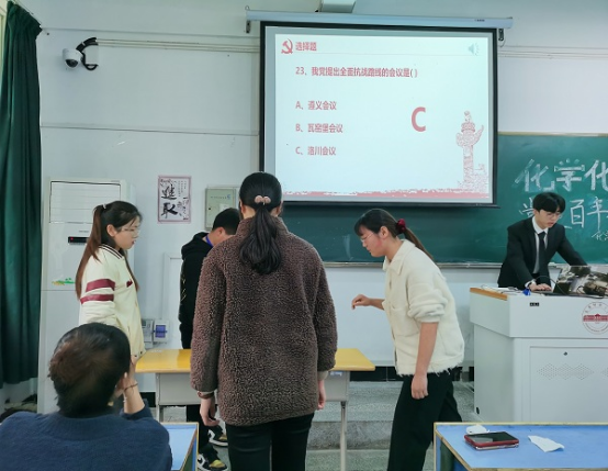 “1935年12月9日,在中国共产党领导下,在哪里首先爆发了大规模的员工抗日救亡爱国运动,这次运动史称一二九运动”,题目宣读完毕,“开始抢答”主持人发出抢答口令,选手们迅速作出反应,各班的抢答选手通过抢纸巾的方式获得优先答题权,比赛进入白热化阶段,各班参赛队伍积极踊跃,赛场气氛高涨,各队伍争锋相对,比分你追我赶。本次党史知识竞赛分为2019级、2020级两组对抗赛,共有16个班级参加,每班四名参赛队员,各派一位代表上台抢答,其余三名队员助力作答。2019级和2020级分别各自进行了三场小组赛和一场决赛,最终由2019级化学专业(3)班、2020级化学专业(3)班获得一等奖。
