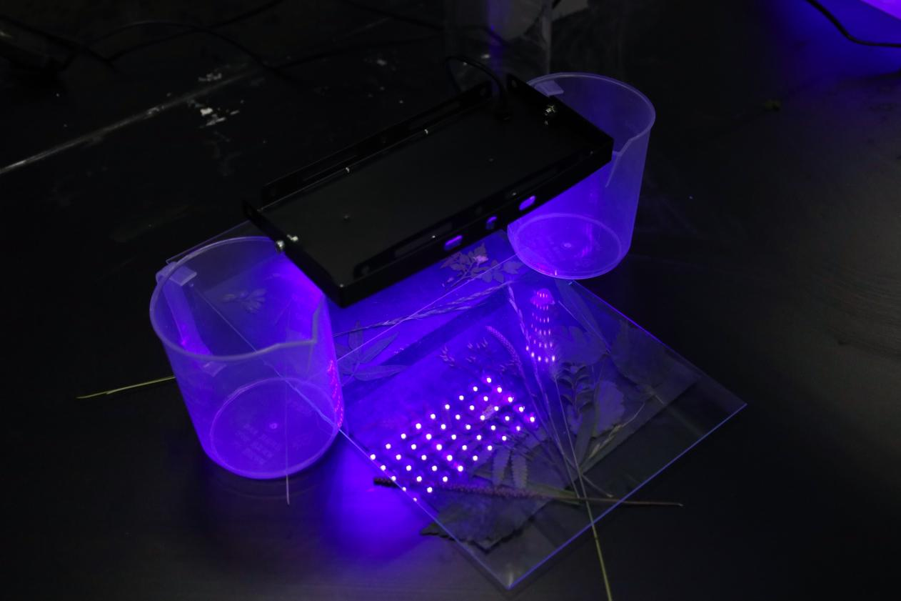 小学教育专业2024(2)班的赵艳在静候显影时表示:“在等待最终成像的10分钟里,我观察到紫外线灯的射线投射在水彩纸上所形成的静态纹路,并且意识到化学实验蕴含着如此趣味与魅力。”她提到,这次活动让她直观体会到化学与艺术的融合,蓝晒作品里的光影纹路,不仅是化学作用的结果,更是内心想法碰撞的结果。