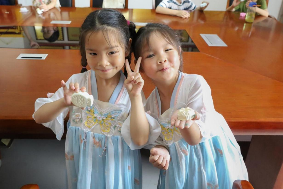 罗婷婷化身石膏制作的“小老师”为小朋友们讲解实验步骤:先取75g石膏粉和25g水搅拌成糊,加几滴喜欢的颜料搅匀,倒进模具后等35 - 40分钟后脱模得到石膏。一旁的汪岚配合着讲解,手拿两个透明塑料杯进行演示,同时补充:“大家知道吗?这个实验的本质是半水硫酸钙和水发生化学反应,生成二水硫酸钙,正是这个过程让石膏从粉末变成了固体。”