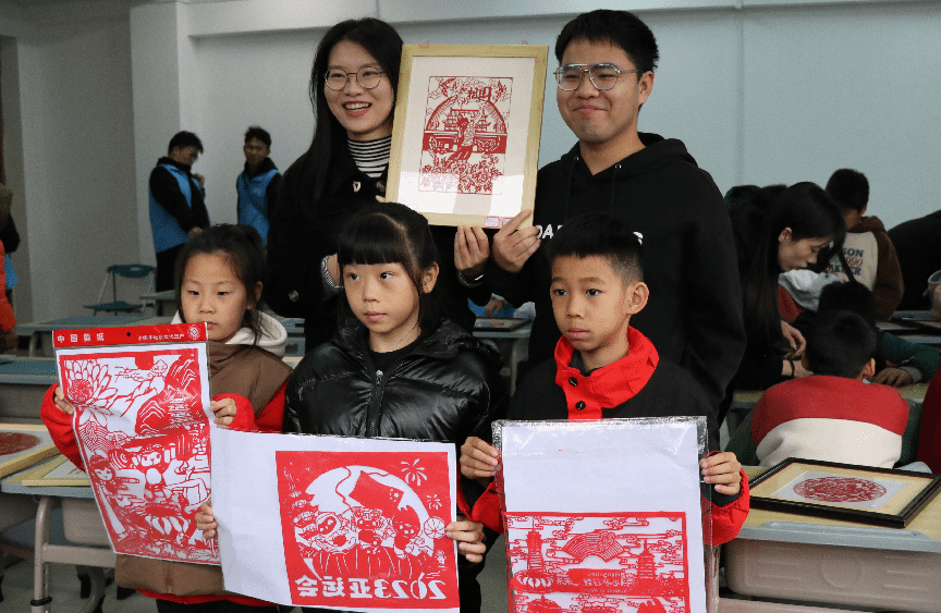 刚走进剪纸工作坊,墙上展示的优秀剪纸作品就引来小朋友们“哇”声一片。细腻的刀法和精湛的技艺展现了剪纸艺术的独特魅力。通过工作人员对作品的讲解,小朋友们从中体悟了传统剪纸艺术的底蕴,并在志愿者们带领下进行了天马行空的剪纸创作,感受非遗技艺的神奇与博大。