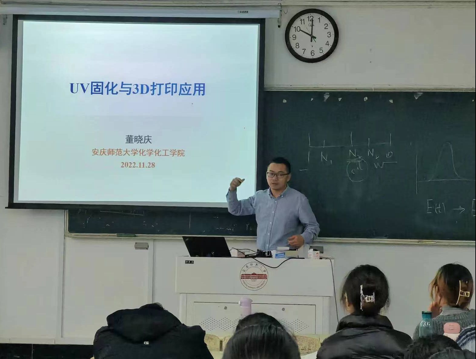 2022年11月28日,sunbet董晓庆副教授在龙山校区B406教室作了题为“UV固化与3D打印应用”的学术报告。公司化学工程与工艺专业50多位同学参加了此次报告会。