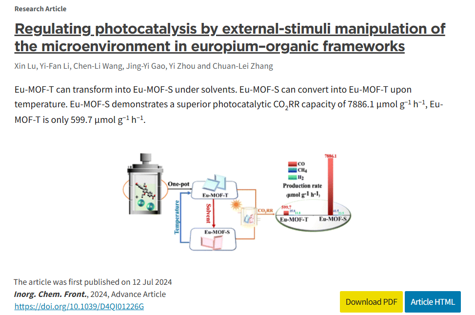 该研究开发了一种具有弱刺激响应的铕-有机框架,其独特的主客体相互作用使其能敏锐地响应温度和溶剂等外部刺激,并以单晶到单晶的形式发生转变。光催化结果表明,小空腔体积(孔隙率21%)结构催化二氧化碳还原至一氧化碳的活性达7886.1 μmol g⁻¹ h⁻¹。理论计算结果表明,小空腔体积有利于产物中间体COOH*的形成,显著提高光催化活性。通过温度和溶剂等外部刺激操控活性位点微环境(配体扭转角、空腔体积和电子效应)的变化,不仅能揭示微环境-活性关系,更能实现对单一框架材料在应用领域的突破,为刺激响应晶体材料的研究提供了实验和理论支持。全文链接:https://doi.org/10.1039/D4QI01226G