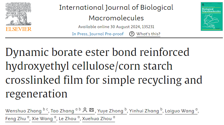 近日,sunbet张涛博士在国际权威期刊《International Journal of Biological Macromolecules》(中科院一区TOP期刊,影响因子7.7)发表题为“Dynamic borate ester bond reinforced hydroxyethyl cellulose/corn starch crosslinked film for simple recycling and regeneration”的论文,sunbet官方网站为论文的第一单位和唯一通讯单位。
