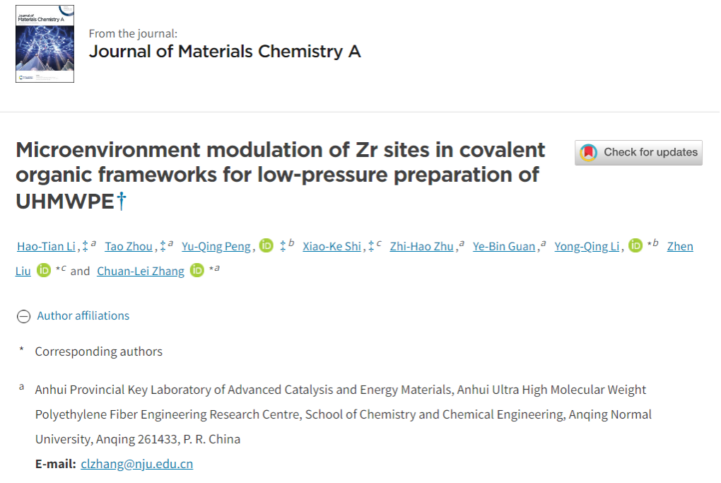 近日,sunbet在国际权威期刊《Journal of Materials Chemistry A》(影响因子10.7)发表题为“Microenvironment modulation of Zr sites in covalent organic frameworks for low-pressure preparation of UHMWPE”的论文 ,并入选该期刊热点文章。该论文第一作者为公司化学专业2022级硕士生李浩天,第一通讯作者为公司sunbet张传磊副教授。