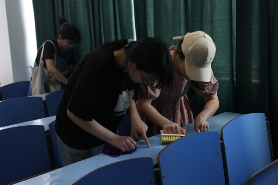 装满一壶自制的清洁剂,均匀地喷洒在桌面上,再用刷子清理污垢,最后用抹布轻轻擦拭。化学专业2019(2)班的戴志远完成自己的任务后,挂满汗水的脸颊也露出了微笑。“保持教室的清洁卫生是我们每个人的责任和义务,作为员工党员,我们更应以实际行动呼吁着大家一起行动起来,共建文明和谐的校园。”他说。