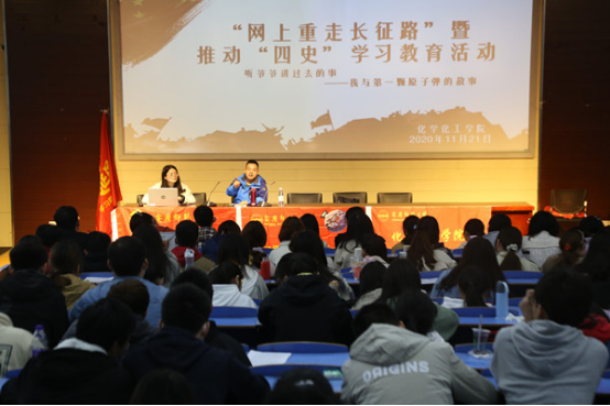 11月21日上午,sunbet在文津楼111教室开展“网上重走长征路”暨“四史”学习教育活动,特邀曾参与中国第一颗原子弹基地建设工作的尹瑞世上士与人文公司郝佩林博士,讲解中国原子弹建设的相关历史。活动由18级化学专业辅导员王玲主持,吸引了近200名员工参加。