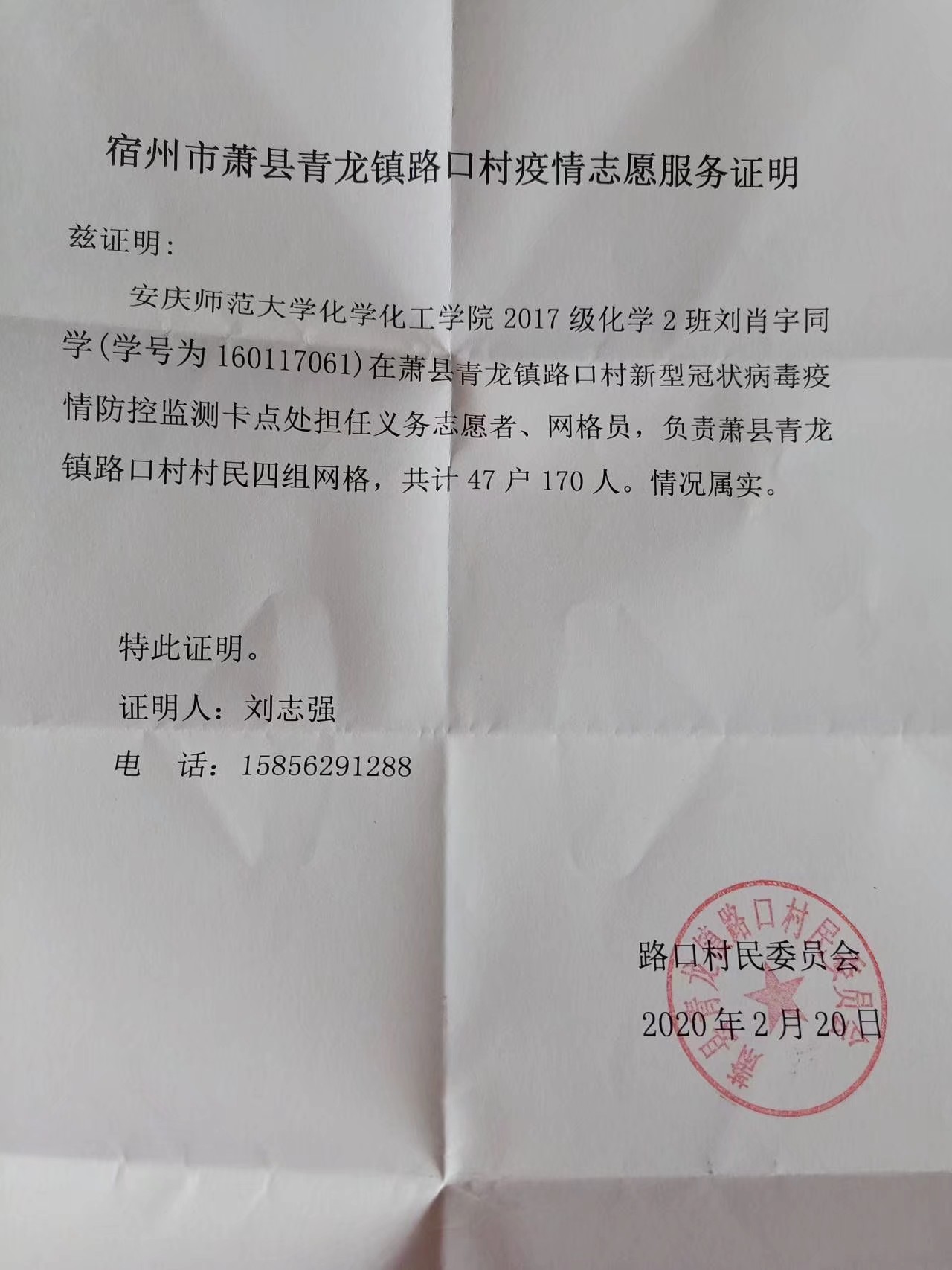 刘肖宇,女,共青团员,2019级化学2班员工。刘肖宇同学疫情期间积极参与安徽省宿州市萧县青龙镇的联防联控志愿服务。从大年初三开始跟随在村委会的父母挨家挨户向村民普及疫情防控知识,劝说村民们居家防疫。主动在当地镇设卡点处测量往来人员体温,登记出入人员个人信息,限制非本地区人员车辆通行,在卡点处喷洒酒精消毒等工作。