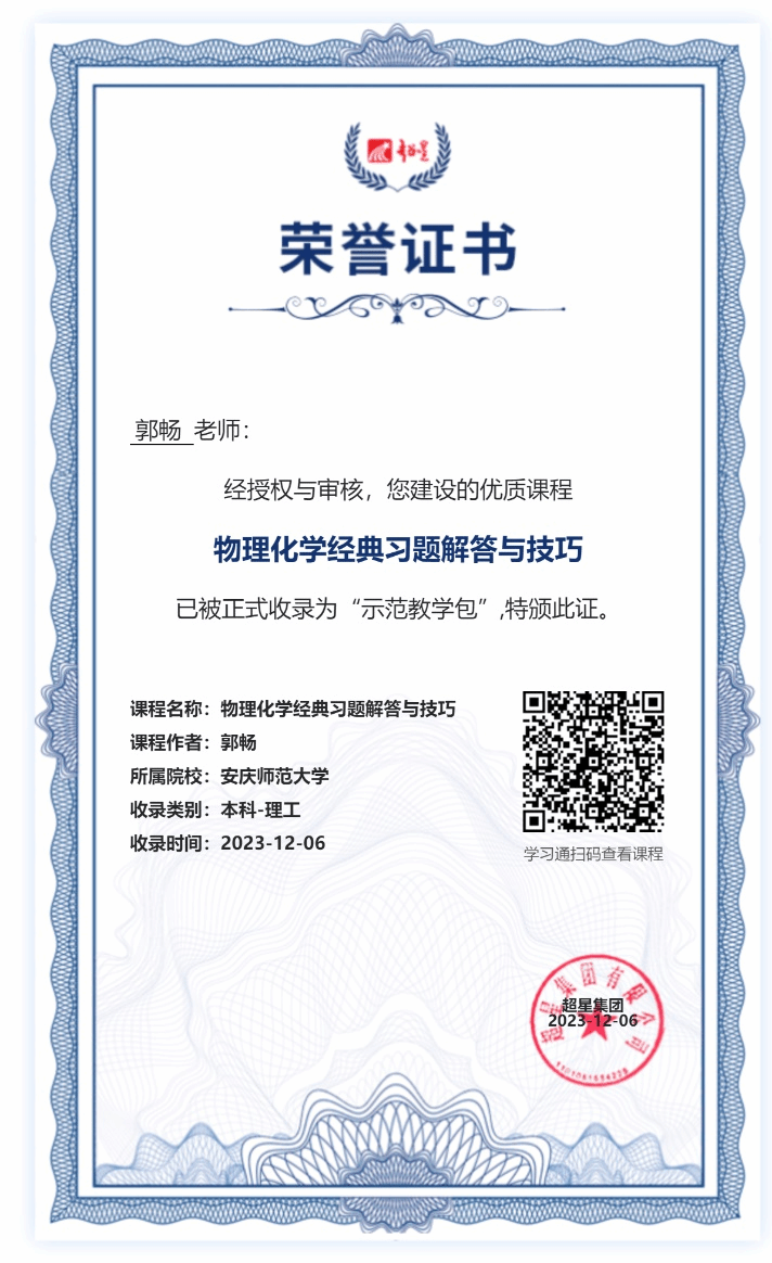 近日,sunbet郭畅教授制作的共享资源课程《物理化学经典习题解答与技巧》,经超星集团有限公司审核与授权,收录为本科理工类“示范教学包”。该课程资源是安徽省精品课程、教学示范课和一流课程的持续建设成果,也是公司线上线下混合式一流课程的阶段性成果。